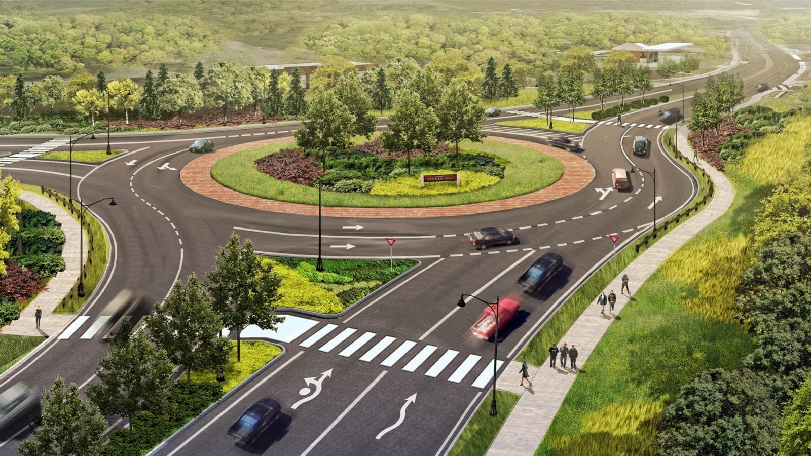 The proposal includes multimodal access and markings, continuous and widened sidewalks, better pedestrian connections across the corridor and intersections, improved ADA access, landscaped medians, new street trees, lighting, and street furniture along both sides of Route 20, and a 225-foot, two-lane roundabout serving as a gateway to the Sturbridge CTD at the intersection of Routes 20 and 131.