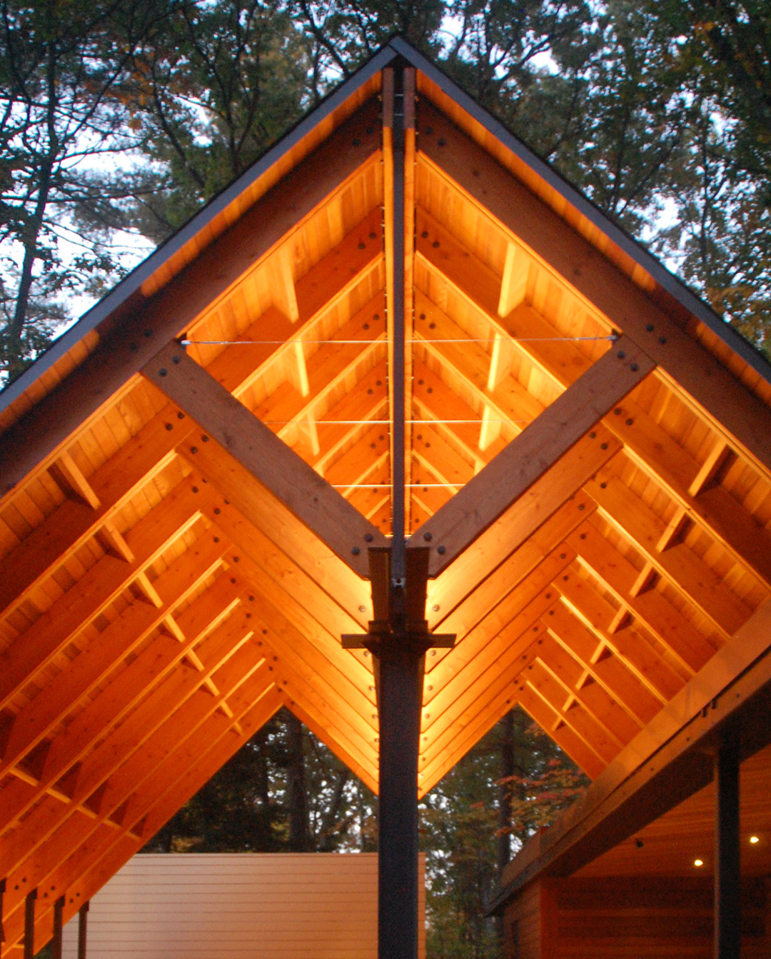 2) The deck, situated on the house’s pond-side, offers expansive views of the pond and surrounding woodlands. Given setback parameters and other site constraints, the deck took on a narrow profile not greater than 14 feet. It is elevated to the second floor, where the primary living spaces are. A bridge connects the main house to the wing-shaped deck, stylistically inspired by the client’s love of aeronautics. The V-shaped columns take on the geometry and structural principles of early biplane technologies.