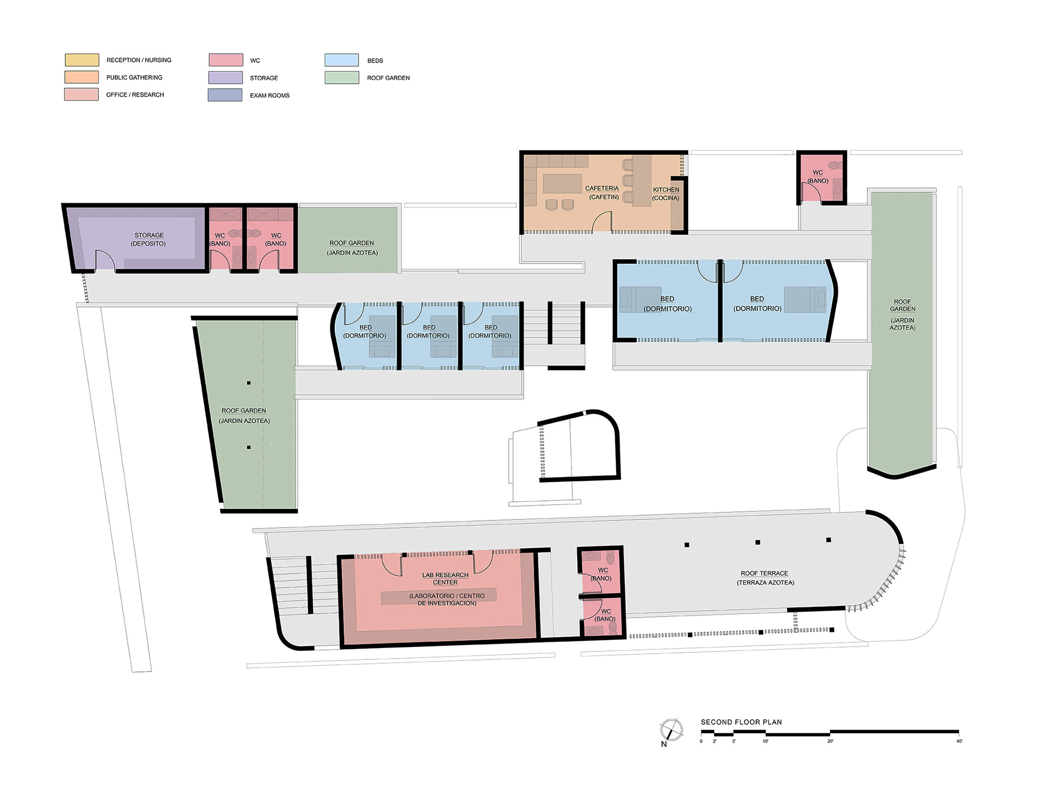 The clinic’s spaces are organized around two larger courtyards and three smaller ones, creating a lush, relaxing oasis. A welcome reprieve from the heat, these courtyards help cool adjacent spaces. The design picks up on local vernacular, particularly stucco walls, tile roofs and native gardens. It also recalls the work of Louis Barragan, a master at working with luscious colors and landscape elements.