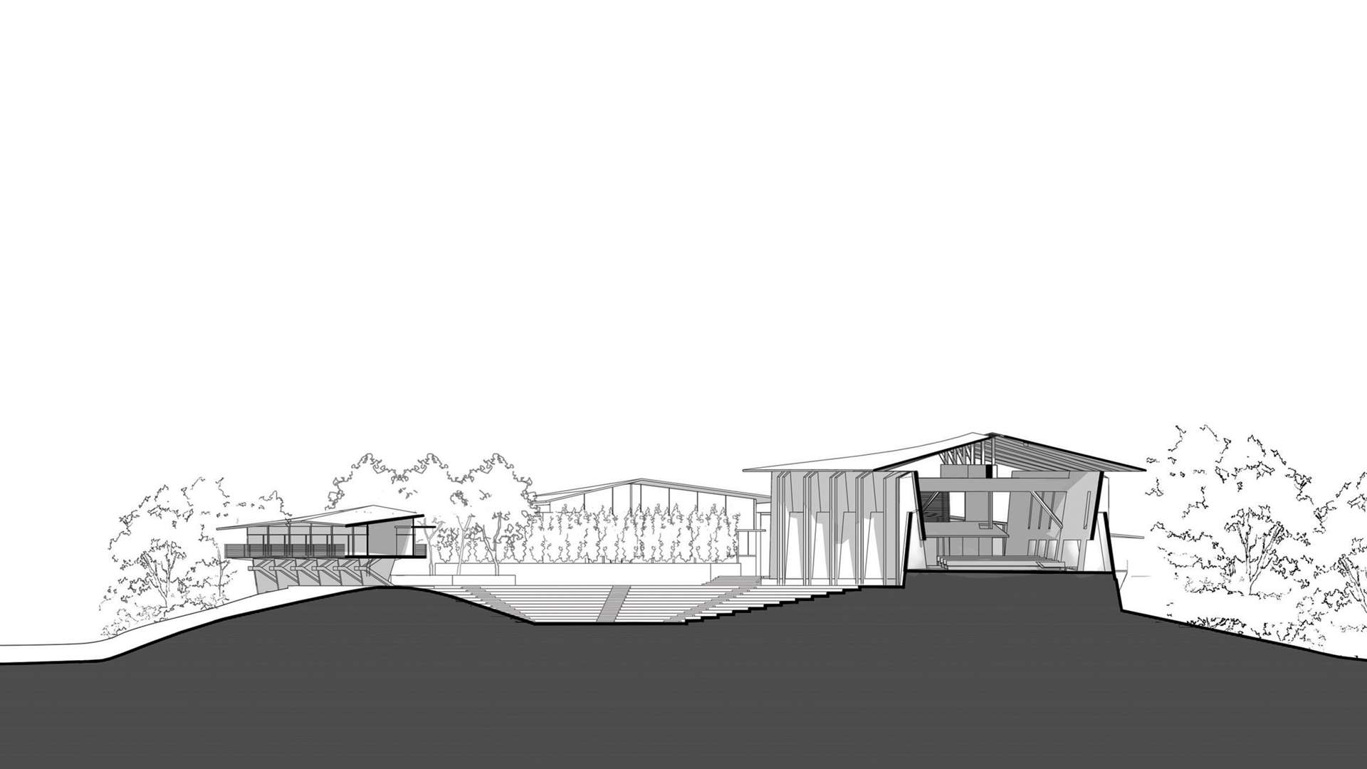 The church will incorporate elements from local churches—pine timber roofs, stucco-clad plaster walls, bell tower—but its interior will be open to the landscape to create a unique spiritual experience. Its canted walls will be oriented along the east-west axis and tilted to capture light and direct views. The entry courtyard plane will gently slope upward into the church, focusing views skyward, and the cross will be silhouetted against the sky when entering from the east. Once inside, the floor will level and slope toward the central valley to the west, focusing attention on first the sky, then the horizon, finally the entire landscape vista, reminding visitors that “heaven is on earth.” For protection against rain and intense sun, a screen of retractable rotating wood shutters slides along steel tracks.